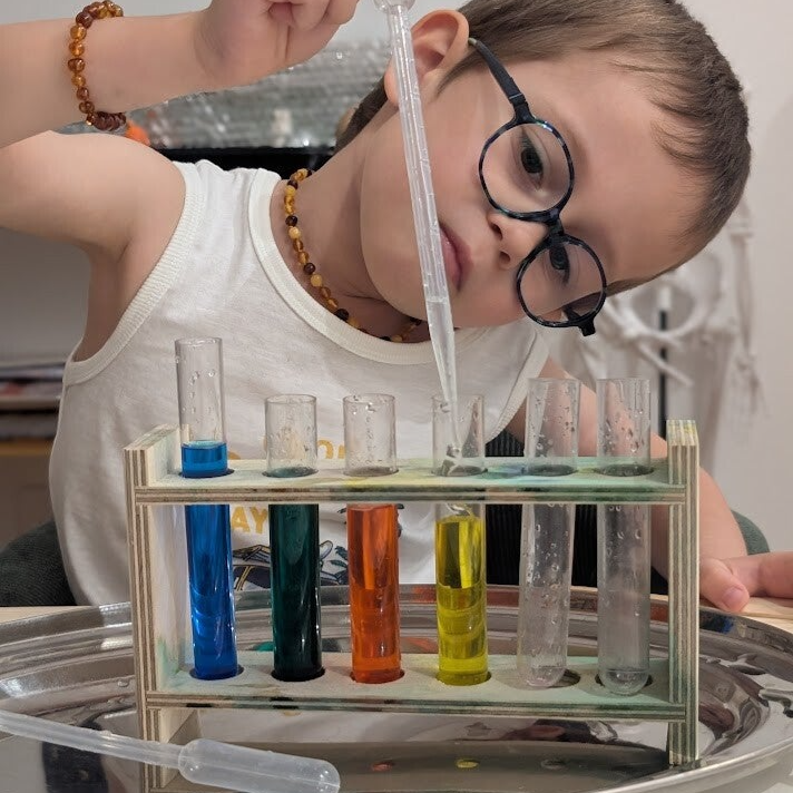 Et puis il y a eu les expériences avec des pipettes et des éprouvettes. Mélanger de l’eau colorée, transférer une goutte d’un récipient à l’autre, observer les couleurs se transformer… Il adorait ça. Ce jeu scientifique demandait une précision incroyable : presser juste assez, relâcher au bon moment, viser le petit tube sans trembler. Pour lui, c’était une expérience magique ; pour sa main, c’était un entraînement idéal.